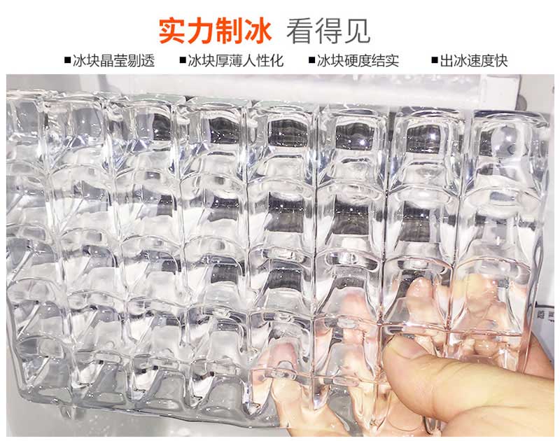 顆粒冰制冰機按制冰方式又分為噴淋式、流水式和浸入式。主要為食用為主,顆粒冰機遍布于奶茶店、酒店、酒吧、KTV、西餐廳、食品廠、便利店以及冷飲店等需要食用冰塊的地方,滿足每一位需要顆粒冰的客戶。顆粒冰機制出的顆粒冰晶瑩剔透,干凈衛生;機器高效、安全、 節能、耐用并環保,安裝方便,所以是客戶食用首選的制冰機器。