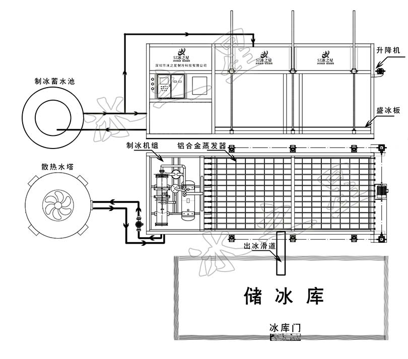 F、脫冰迅速快:水凍結(jié)成冰后,制冰系統(tǒng)反向加熱,熱氟進入蒸發(fā)器脫冰,脫冰速度快;脫冰后直接落在冰輸送裝置上,無需行車等取吊設備;